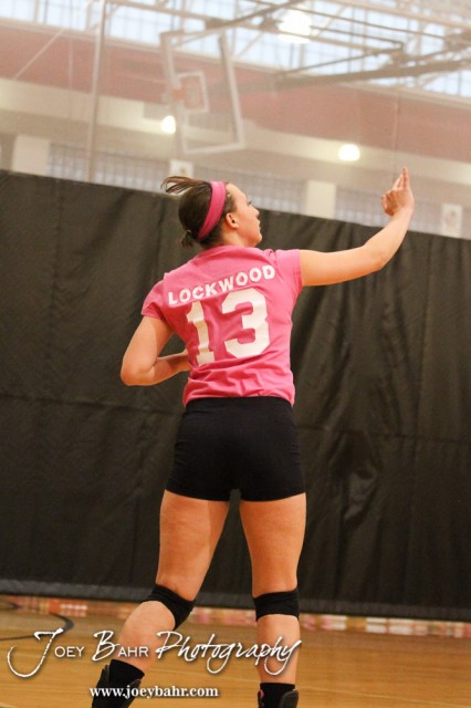 Hoisington Lady Cardinal Ashley Lockwood (#13) serves during the Hoisington versus Smoky Valley volleyball match with Hoisington winning in two sets at Hoisington Activity Center in Hoisington, Kansas on October 22, 2013. (Photo: Joey Bahr, www.joeybahr.com)