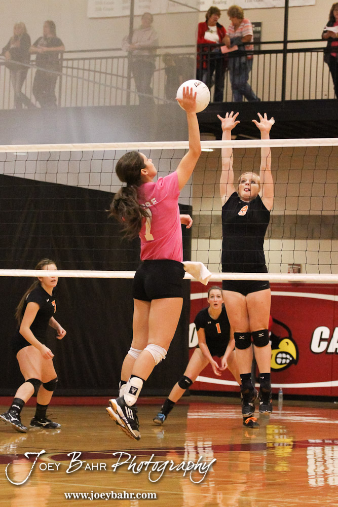 Hoisington Lady Cardinal Jordan Moore (#7) hits the ball over the net while Smoky Valley Lady Viking Hanah Godfrey (#3) tries to block it during the Hoisington versus Smoky Valley volleyball match with Hoisington winning in two sets at Hoisington Activity Center in Hoisington, Kansas on October 22, 2013. (Photo: Joey Bahr, www.joeybahr.com)