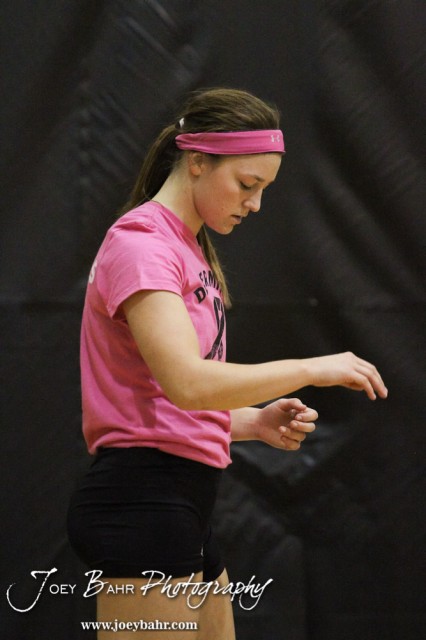 Hoisington Lady Cardinal Lexi Sanders (#6) prepares to serve during the Hoisington versus Smoky Valley volleyball match with Hoisington winning in two sets at Hoisington Activity Center in Hoisington, Kansas on October 22, 2013. (Photo: Joey Bahr, www.joeybahr.com)
