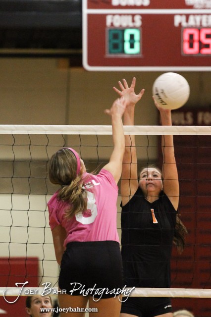 Hoisington Lady Cardinal Abbi Demel (#8) hits the ball over the net while Smoky Valley Lady Viking Kelsie Anderson (#1) sets a wall during the Hoisington versus Smoky Valley volleyball match with Hoisington winning in two sets at Hoisington Activity Center in Hoisington, Kansas on October 22, 2013. (Photo: Joey Bahr, www.joeybahr.com)