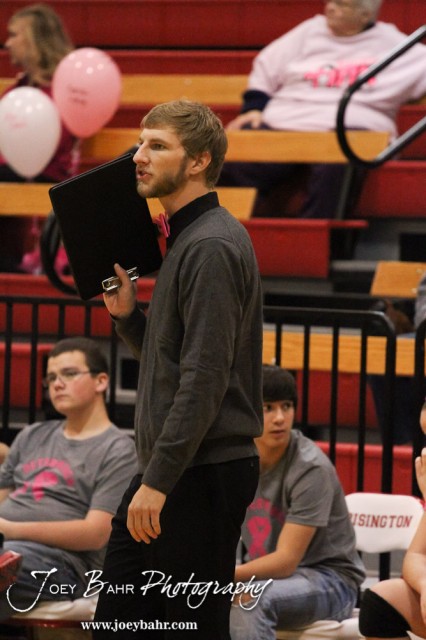 Hoisington Lady Cardinal Head Coach Jon Bingesser calls in a play during the Hoisington versus Smoky Valley volleyball match with Hoisington winning in two sets at Hoisington Activity Center in Hoisington, Kansas on October 22, 2013. (Photo: Joey Bahr, www.joeybahr.com)