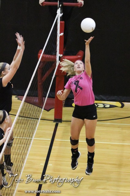 Hoisington Lady Cardinal Abi Rziha (#21) tips the ball over the net during the Hoisington versus Smoky Valley volleyball match with Hoisington winning in two sets at Hoisington Activity Center in Hoisington, Kansas on October 22, 2013. (Photo: Joey Bahr, www.joeybahr.com)