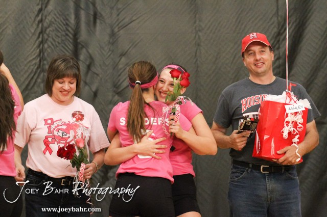 Hoisington Lady Cardinal Ashley Lockwood (#13) and her parents are recognized during Parent’s Night ceremony before the Hoisington versus Smoky Valley volleyball match with Hoisington winning in two sets at Hoisington Activity Center in Hoisington, Kansas on October 22, 2013. (Photo: Joey Bahr, www.joeybahr.com)