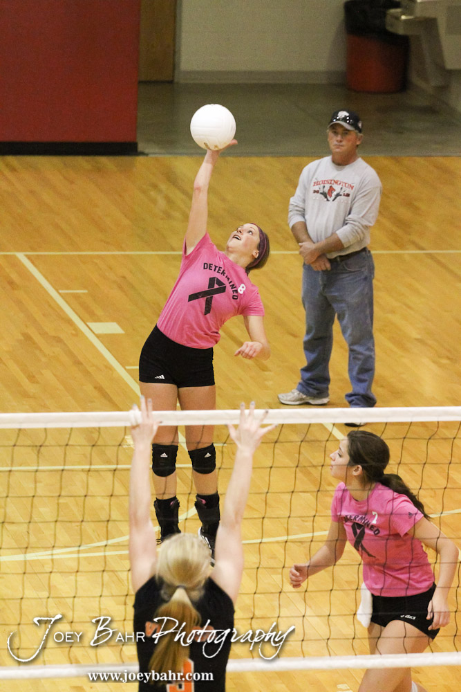 Hoisington Lady Cardinal Abbi Demel (#8) goes to hit a ball over during the Hoisington versus Smoky Valley volleyball match with Hoisington winning in two sets at Hoisington Activity Center in Hoisington, Kansas on October 22, 2013. (Photo: Joey Bahr, www.joeybahr.com)