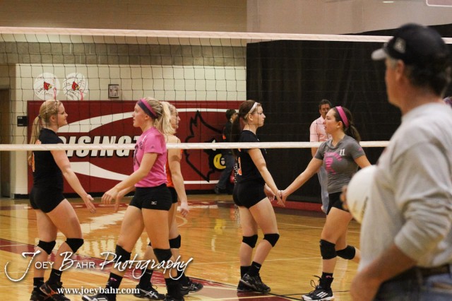 The Smoky Valley Lady Vikings and Hoisington Lady Cardinals shake hands following the Hoisington versus Smoky Valley volleyball match with Hoisington winning in two sets at Hoisington Activity Center in Hoisington, Kansas on October 22, 2013. (Photo: Joey Bahr, www.joeybahr.com)
