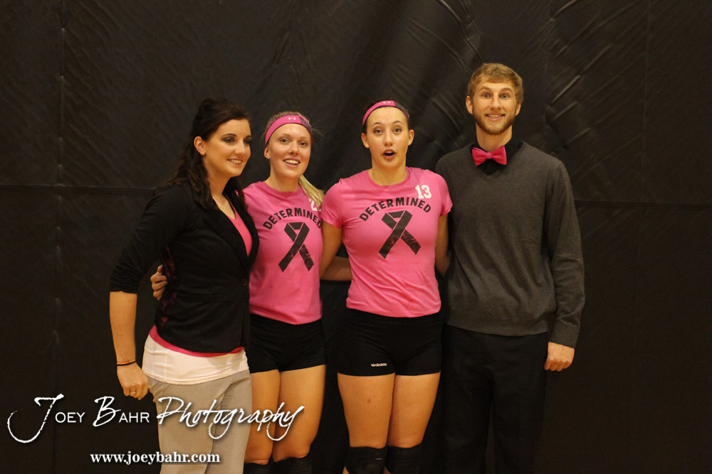 Hoisington Lady Cardinal Seniors Abi Rziha (#21) and Ashley Lockwood (#13) take a picture with Assistant Coach Jordan Nettleingham and Head Coach Jon Bingesser following the Hoisington versus Smoky Valley volleyball match with Hoisington winning in two sets at Hoisington Activity Center in Hoisington, Kansas on October 22, 2013. (Photo: Joey Bahr, www.joeybahr.com)