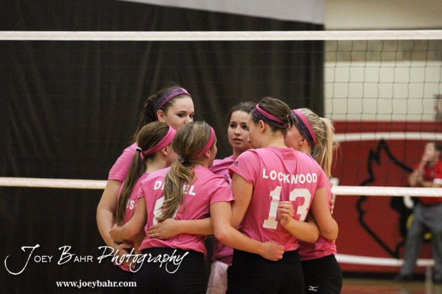 The Hoisington Lady Cardinals huddle up before the Hoisington versus Smoky Valley volleyball match with Hoisington winning in two sets at Hoisington Activity Center in Hoisington, Kansas on October 22, 2013. (Photo: Joey Bahr, www.joeybahr.com)