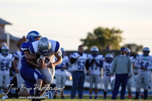 Ness City Eagle Pedro Flores (#3) tackles Spearville Lancer Nathan Stein (#8) during the Spearville versus Ness City High School 8-Man Football Game with Spearville winning 50 to 38 at Ness City High School in Ness City, Kansas on October 3, 2014. (Photo: Joey Bahr, www.joeybahr.com)