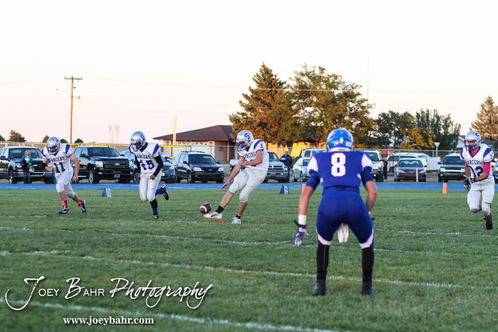 Spearville Lancer Nathan Stein (#8) kicks the ball off during the Spearville versus Ness City High School 8-Man Football Game with Spearville winning 50 to 38 at Ness City High School in Ness City, Kansas on October 3, 2014. (Photo: Joey Bahr, www.joeybahr.com)