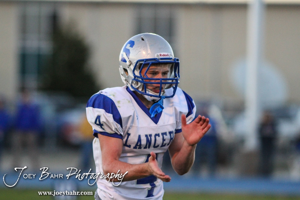 Spearville Lancer Luke Heskamp (#4) celebrates scoring a touchdown during the Spearville versus Ness City High School 8-Man Football Game with Spearville winning 50 to 38 at Ness City High School in Ness City, Kansas on October 3, 2014. (Photo: Joey Bahr, www.joeybahr.com)