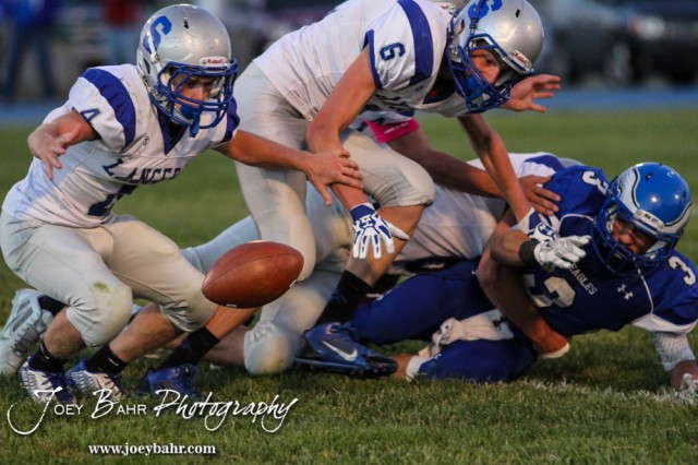 Spearville Lancer Luke Heskamp (#4) scrambles for a loose ball during the Spearville versus Ness City High School 8-Man Football Game with Spearville winning 50 to 38 at Ness City High School in Ness City, Kansas on October 3, 2014. (Photo: Joey Bahr, www.joeybahr.com)