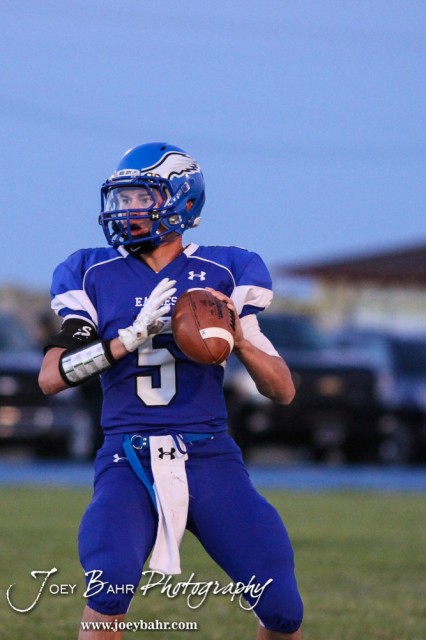 Ness City Eagle Tanner Mcmillen (#5) looks for an open receiver during the Spearville versus Ness City High School 8-Man Football Game with Spearville winning 50 to 38 at Ness City High School in Ness City, Kansas on October 3, 2014. (Photo: Joey Bahr, www.joeybahr.com)
