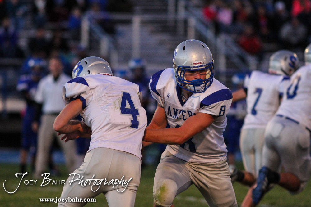 Spearville Lancer Nathan Stein (#8) fakes a handoff to Luke Heskamp (#4) during the Spearville versus Ness City High School 8-Man Football Game with Spearville winning 50 to 38 at Ness City High School in Ness City, Kansas on October 3, 2014. (Photo: Joey Bahr, www.joeybahr.com)