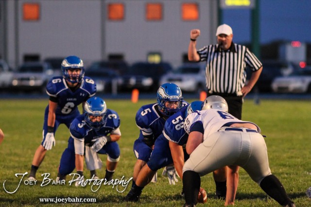 Ness City Eagle Tanner Mcmillen (#5) lines up under the center during the Spearville versus Ness City High School 8-Man Football Game with Spearville winning 50 to 38 at Ness City High School in Ness City, Kansas on October 3, 2014. (Photo: Joey Bahr, www.joeybahr.com)