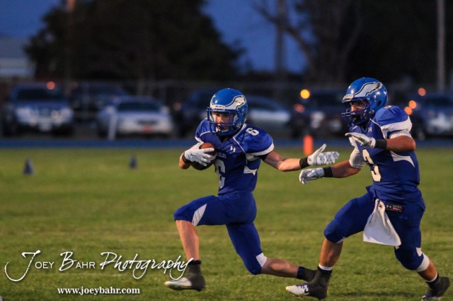 Ness City Eagle Jacob Hoss (#6) carries the ball as Pedro Flores (#3) blocks during the Spearville versus Ness City High School 8-Man Football Game with Spearville winning 50 to 38 at Ness City High School in Ness City, Kansas on October 3, 2014. (Photo: Joey Bahr, www.joeybahr.com)