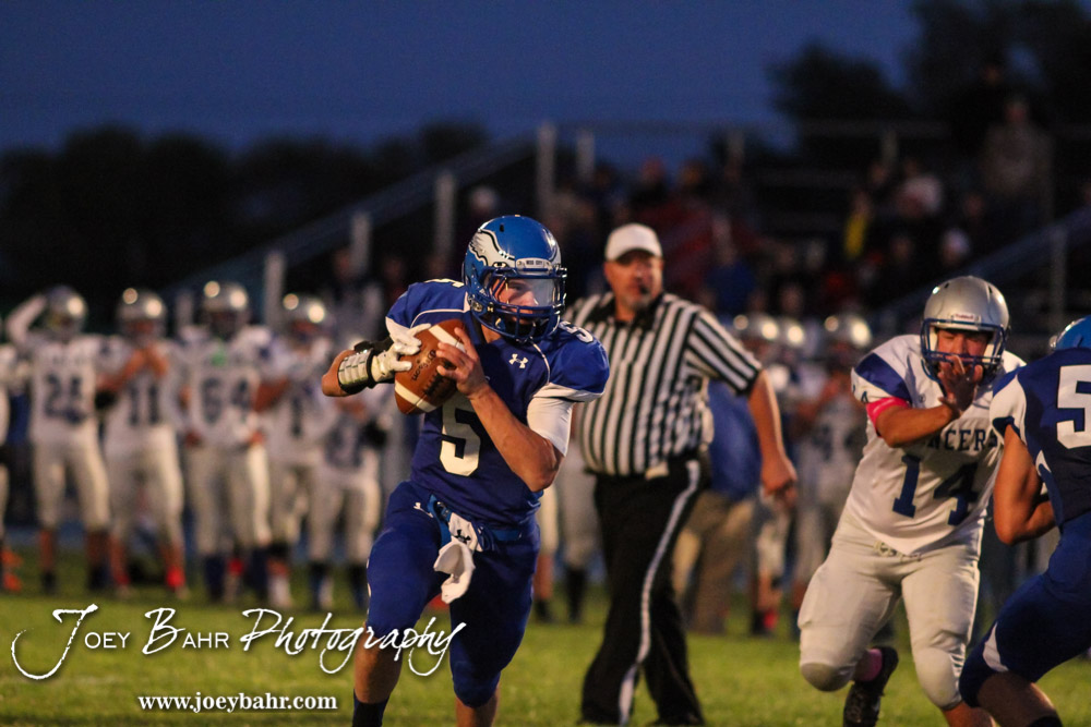 Ness City Eagle Tanner Mcmillen (#5) scrambles with the ball during the Spearville versus Ness City High School 8-Man Football Game with Spearville winning 50 to 38 at Ness City High School in Ness City, Kansas on October 3, 2014. (Photo: Joey Bahr, www.joeybahr.com)