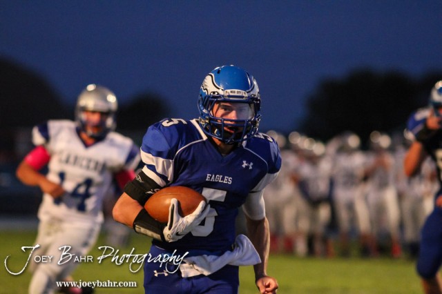 Ness City Eagle Tanner Mcmillen (#5) runs to the end zone during the Spearville versus Ness City High School 8-Man Football Game with Spearville winning 50 to 38 at Ness City High School in Ness City, Kansas on October 3, 2014. (Photo: Joey Bahr, www.joeybahr.com)