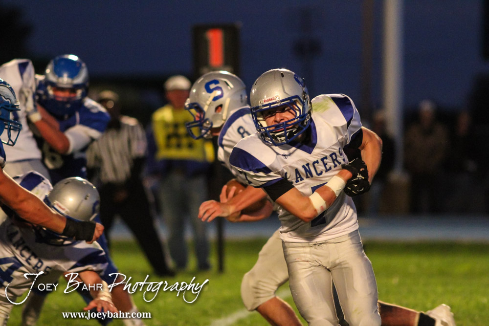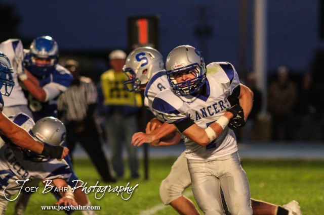 Spearville Lancer Brandon Davis (#7) fakes that he has the ball during the Spearville versus Ness City High School 8-Man Football Game with Spearville winning 50 to 38 at Ness City High School in Ness City, Kansas on October 3, 2014. (Photo: Joey Bahr, www.joeybahr.com)