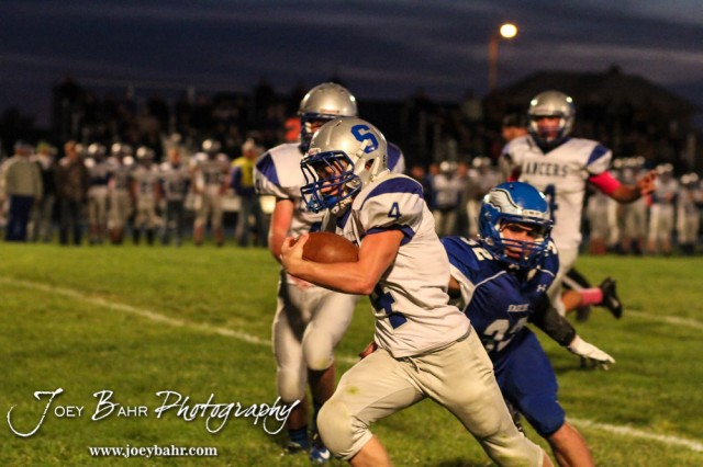 Spearville Lancer Luke Heskamp (#4) evades the tackle of Ness City Eagle Caleb Lee (#32) during the Spearville versus Ness City High School 8-Man Football Game with Spearville winning 50 to 38 at Ness City High School in Ness City, Kansas on October 3, 2014. (Photo: Joey Bahr, www.joeybahr.com)