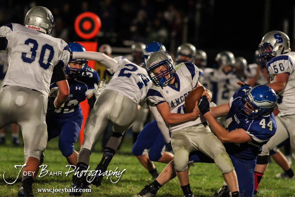 Spearville Lancer Luke Heskamp (#4) holds tight to the ball as a Ness City Eagle tries to strip the ball during the Spearville versus Ness City High School 8-Man Football Game with Spearville winning 50 to 38 at Ness City High School in Ness City, Kansas on October 3, 2014. (Photo: Joey Bahr, www.joeybahr.com)