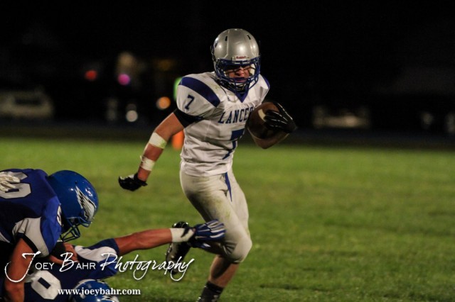 Spearville Lancer Brandon Davis (#7) runs past two Ness City Eagles during the Spearville versus Ness City High School 8-Man Football Game with Spearville winning 50 to 38 at Ness City High School in Ness City, Kansas on October 3, 2014. (Photo: Joey Bahr, www.joeybahr.com)