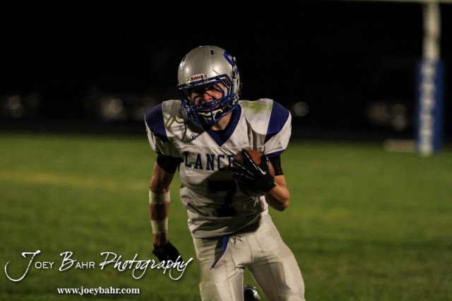 Spearville Lancer Brandon Davis (#7) runs with the ball during the Spearville versus Ness City High School 8-Man Football Game with Spearville winning 50 to 38 at Ness City High School in Ness City, Kansas on October 3, 2014. (Photo: Joey Bahr, www.joeybahr.com)