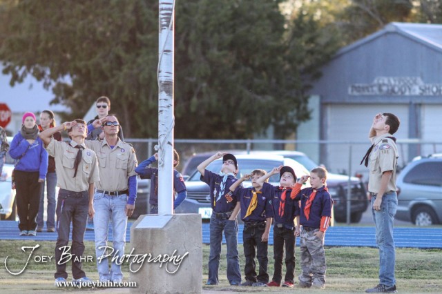 Cub and Boy Scouts salute the flag during the National Anthem before the Spearville versus Ness City High School 8-Man Football Game with Spearville winning 50 to 38 at Ness City High School in Ness City, Kansas on October 3, 2014. (Photo: Joey Bahr, www.joeybahr.com)