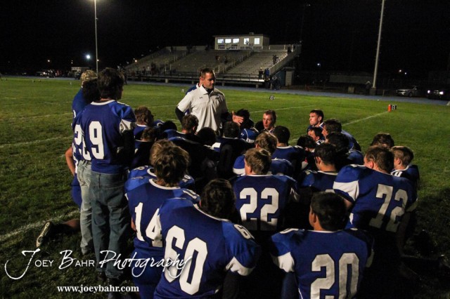 Ness City Eagle Head Coach Chris Bamberger addresses his team following the Spearville versus Ness City High School 8-Man Football Game with Spearville winning 50 to 38 at Ness City High School in Ness City, Kansas on October 3, 2014. (Photo: Joey Bahr, www.joeybahr.com)