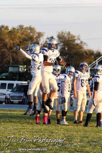 Spearville Lancer Hunter Stephenson (#24) greets Kaden Stein (#30) during the Spearville versus Ness City High School 8-Man Football Game with Spearville winning 50 to 38 at Ness City High School in Ness City, Kansas on October 3, 2014. (Photo: Joey Bahr, www.joeybahr.com)