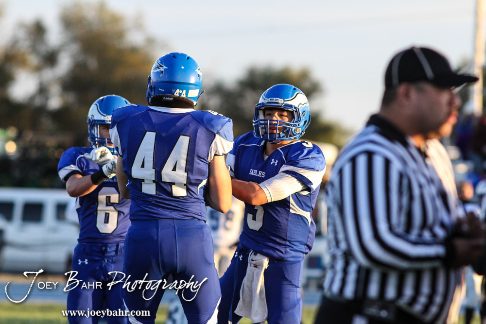 Ness City Eagle Pedro Flores (#3) greets a teammate during the Spearville versus Ness City High School 8-Man Football Game with Spearville winning 50 to 38 at Ness City High School in Ness City, Kansas on October 3, 2014. (Photo: Joey Bahr, www.joeybahr.com)