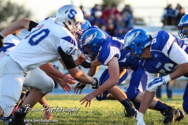 Ness City Eagle Aaron Goodman (#50) launches out of his stance during the Spearville versus Ness City High School 8-Man Football Game with Spearville winning 50 to 38 at Ness City High School in Ness City, Kansas on October 3, 2014. (Photo: Joey Bahr, www.joeybahr.com)