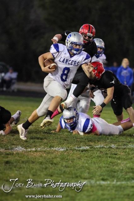Spearville Lancer Nathan Stein (#8) rushes with the ball during the Spearville at Hodgeman County High School Football Game with Spearville winning 50 to 28 at Sayler Field in Jetmore, Kansas on October 24, 2014. (Photo: Joey Bahr, www.joeybahr.com)