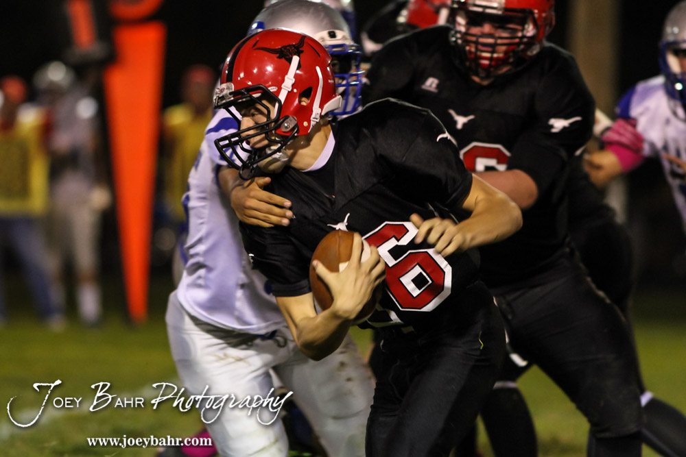 Hodgeman County Longhorn Jacob Salmans (#16) rushes with the ball during the Spearville at Hodgeman County High School Football Game with Spearville winning 50 to 28 at Sayler Field in Jetmore, Kansas on October 24, 2014. (Photo: Joey Bahr, www.joeybahr.com)