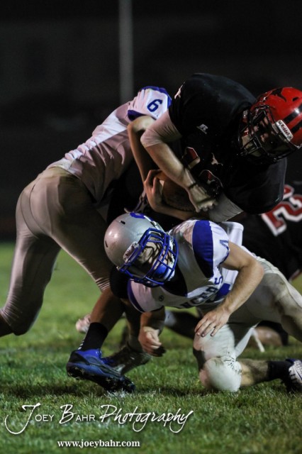 Spearville Lancers Clinton Stein (#6) and Luke Heskamp (#4) go high and low to tackle Hodgeman County Longhorn Will Crabill (#10) during the Spearville at Hodgeman County High School Football Game with Spearville winning 50 to 28 at Sayler Field in Jetmore, Kansas on October 24, 2014. (Photo: Joey Bahr, www.joeybahr.com)