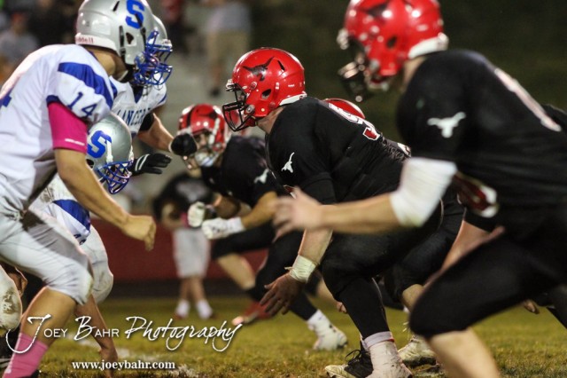 The Hodgeman County Longhorn line fires off to find a Spearville Lancer to block during the Spearville at Hodgeman County High School Football Game with Spearville winning 50 to 28 at Sayler Field in Jetmore, Kansas on October 24, 2014. (Photo: Joey Bahr, www.joeybahr.com)