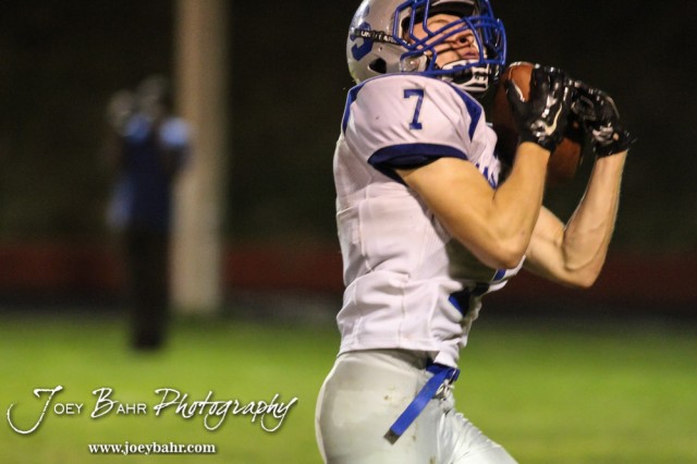 Spearville Lancer Brandon Davis (#7) catches a pass for a touchdown during the Spearville at Hodgeman County High School Football Game with Spearville winning 50 to 28 at Sayler Field in Jetmore, Kansas on October 24, 2014. (Photo: Joey Bahr, www.joeybahr.com)