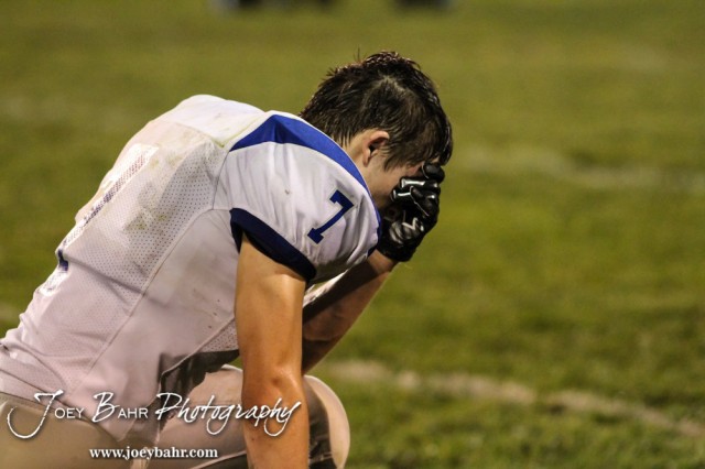 Spearville Lancer Brandon Davis (#7) takes a knee as a teammate is tended to by paramedics during the Spearville at Hodgeman County High School Football Game with Spearville winning 50 to 28 at Sayler Field in Jetmore, Kansas on October 24, 2014. (Photo: Joey Bahr, www.joeybahr.com)