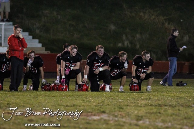 Members of the Hodgeman County Longhorns take a knee as a paramedics look at a Spearville Lancer during the Spearville at Hodgeman County High School Football Game with Spearville winning 50 to 28 at Sayler Field in Jetmore, Kansas on October 24, 2014. (Photo: Joey Bahr, www.joeybahr.com)