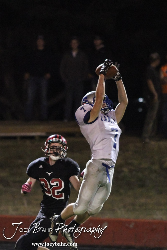 Spearville Lancer Brandon Davis (#7) intercepts a pass during the Spearville at Hodgeman County High School Football Game with Spearville winning 50 to 28 at Sayler Field in Jetmore, Kansas on October 24, 2014. (Photo: Joey Bahr, www.joeybahr.com)