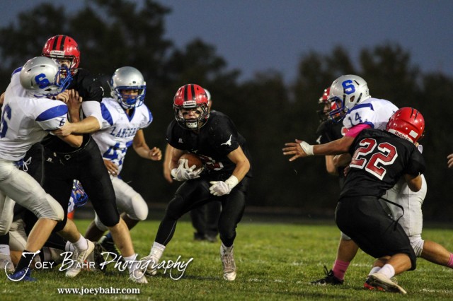 Hodgeman County Longhorn Kolt Washburn (#8) finds a hole to run through during the Spearville at Hodgeman County High School Football Game with Spearville winning 50 to 28 at Sayler Field in Jetmore, Kansas on October 24, 2014. (Photo: Joey Bahr, www.joeybahr.com)