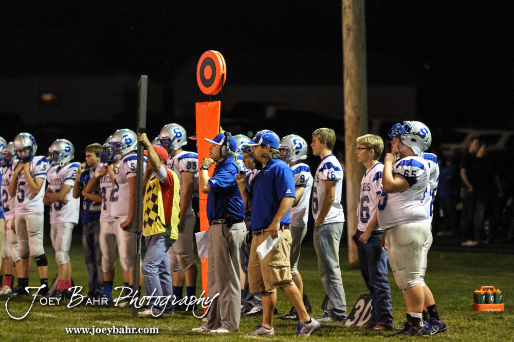 Spearville Lancer Assistant Coach Chris Sohm and Head Coach Matt Fowler call in the defensive formation during the Spearville at Hodgeman County High School Football Game with Spearville winning 50 to 28 at Sayler Field in Jetmore, Kansas on October 24, 2014. (Photo: Joey Bahr, www.joeybahr.com)