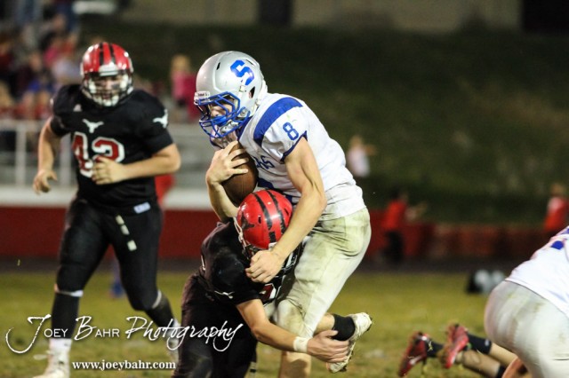 Hodgeman County Longhorn Nick Shiew (#20) tackles Spearville Lancer Nathan Stein (#8) during the Spearville at Hodgeman County High School Football Game with Spearville winning 50 to 28 at Sayler Field in Jetmore, Kansas on October 24, 2014. (Photo: Joey Bahr, www.joeybahr.com)