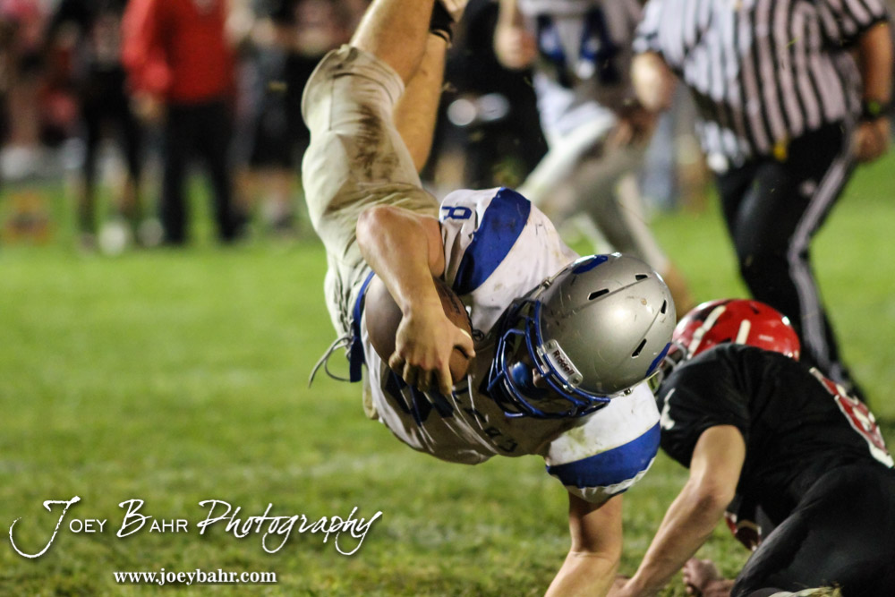 Spearville Lancer Nathan Stein (#8) dives to score a touchdown during the Spearville at Hodgeman County High School Football Game with Spearville winning 50 to 28 at Sayler Field in Jetmore, Kansas on October 24, 2014. (Photo: Joey Bahr, www.joeybahr.com)