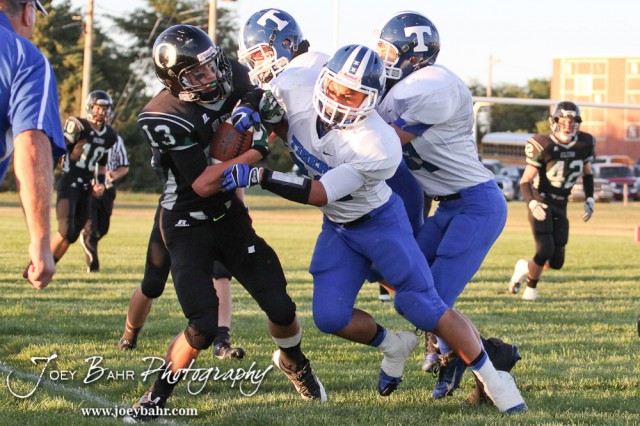 St. John Tiger Juan Neri-Leon (#22) and two teammates force Central Plains Oiler Michael Lamalsch (#13) out of bounds during the St. John versus Central Plains High School Football Game with Central Plains winning 54 to 8 at Central Plains High School in Claflin, Kansas on September 20, 2013. (Photo: Joey Bahr, www.joeybahr.com)