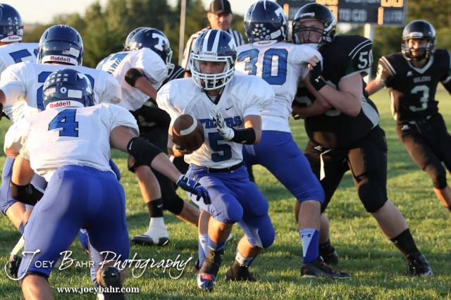 St. John Tiger Preston Miller (#5) turns to hand the ball of to Schuyler Brown (#4) during the St. John versus Central Plains High School Football Game with Central Plains winning 54 to 8 at Central Plains High School in Claflin, Kansas on September 20, 2013. (Photo: Joey Bahr, www.joeybahr.com)