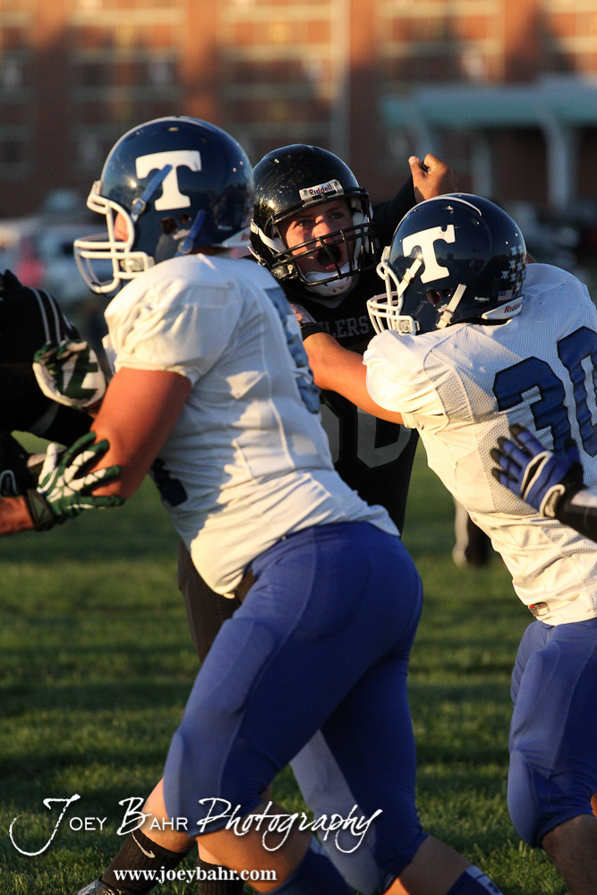St. John Tiger Austin White (#30) tries to block Central Plains Oiler Jacob Woodmansee (#50) during the St. John versus Central Plains High School Football Game with Central Plains winning 54 to 8 at Central Plains High School in Claflin, Kansas on September 20, 2013. (Photo: Joey Bahr, www.joeybahr.com)