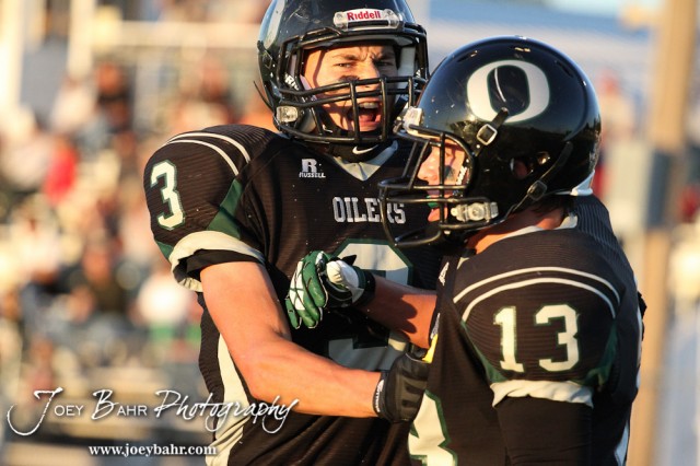 Central Plains Oiler Layne Bieberle (#3) congratulates Michael Lamatsch (#13) for his touchdown during the St. John versus Central Plains High School Football Game with Central Plains winning 54 to 8 at Central Plains High School in Claflin, Kansas on September 20, 2013. (Photo: Joey Bahr, www.joeybahr.com)