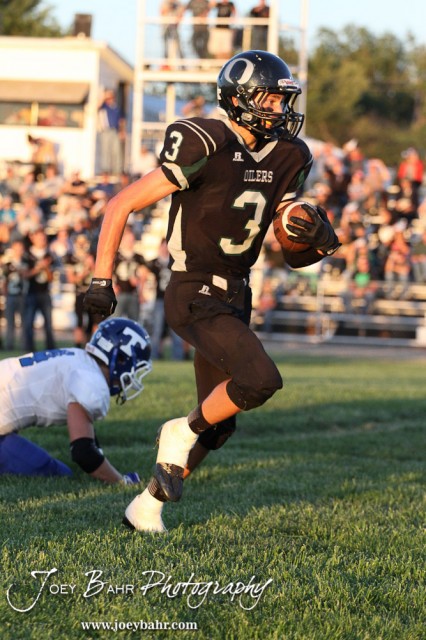 Central Plains Oiler Layne Bieberle (#3) runs past a St. John Tiger defender during the St. John versus Central Plains High School Football Game with Central Plains winning 54 to 8 at Central Plains High School in Claflin, Kansas on September 20, 2013. (Photo: Joey Bahr, www.joeybahr.com)