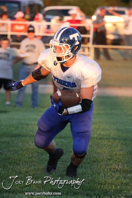 St. John Tiger Schuyler Brown (#4) looks for a hole during the St. John versus Central Plains High School Football Game with Central Plains winning 54 to 8 at Central Plains High School in Claflin, Kansas on September 20, 2013. (Photo: Joey Bahr, www.joeybahr.com)