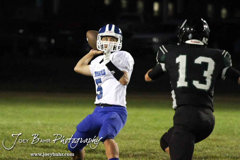 St. John Tiger Preston Miller (#5) throws a pass during the St. John versus Central Plains High School Football Game with Central Plains winning 54 to 8 at Central Plains High School in Claflin, Kansas on September 20, 2013. (Photo: Joey Bahr, www.joeybahr.com)